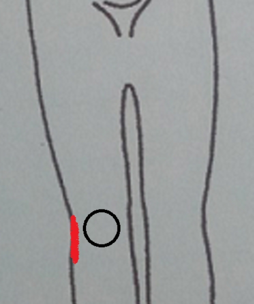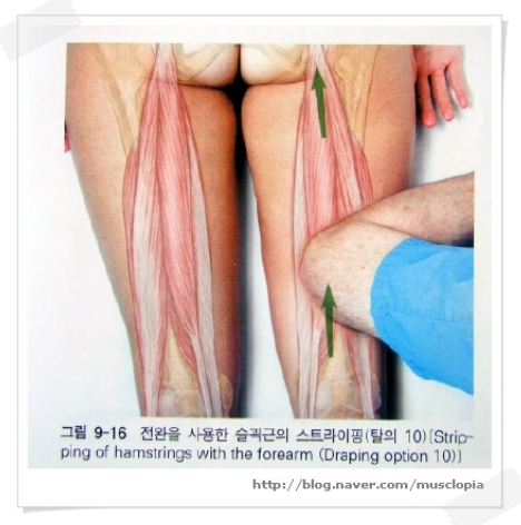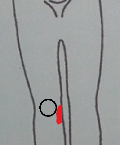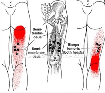뒤허벅지 근육의 통증유발점(x) 는 허벅지 중간에 있지만